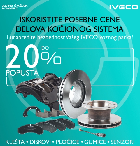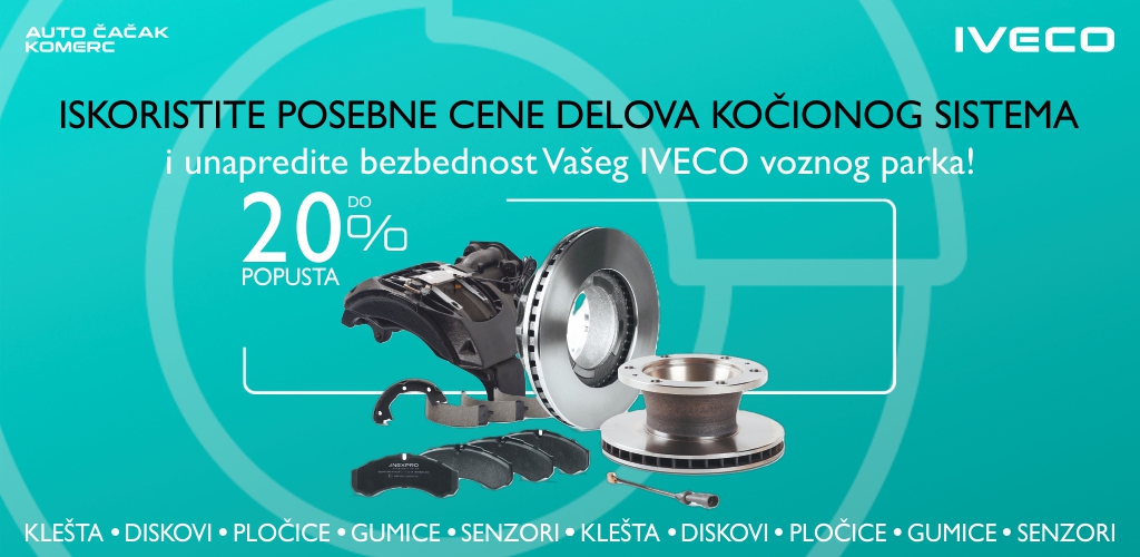 Posebne cene delova kočionog sistema važe isključivo do 30. aprila ili do isteka zaliha. Zbog velikog interesovanja broj slobodnih termina je ograničen. Pozovite odmah i obezbedite ugradnju originalnih IVECO delova uz značajnu optimizaciju troškova održavanja.